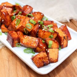 Recipe By Ashley Lecker of Cheese Curds in Paradise Teriyaki Glazed Sweetpotatoes feature tender roasted sweetpotato pieces coated in a rich, savory teriyaki sauce and finished with green onions and sesame seeds. Roasted until caramelized and flavorful, this dish balances natural sweetness with umami depth. Easy to prepare and full of bold flavor, it works well as a side dish or a simple plant forward entrée.