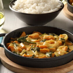 Thai Sweetpotato Curry combines tender sweetpotatoes, spinach, and onions simmered in a creamy coconut milk sauce flavored with yellow curry paste and almond butter. This comforting dish delivers a rich balance of sweet, savory, and mildly spicy flavors and can be served over rice with peanuts and fresh cilantro for garnish.